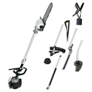 Egy erős, 42,7 cm³ lökettérfogatú, kétütemű benzinmotor biztosítja a szükséges teljesítményt ezeknek a feladatoknak a végrehajtásához. A rezgéscsillapított kialakítás és a mellékelt csípővédővel ellátott vállpánt kényelmes és fáradtságmentes munkavégzést biztosít. A gyorsrögzítőnek köszönhetően a készülék egyetlen mozdulattal fűnyíróból, bozótvágóvá, sövényvágóvá, rúdmetszővé vagy lombfújóvá alakítható.A fűnyíró maximális vágási szélessége 450 mm, és tiszta vágást biztosít a pázsit széleinek és kisebb területek nyírásánál. A dupla menetes orsón összesen 4 m cérna áll rendelkezésre. A munkavégzést megkönnyíti az integrált automata menetfúró rendszer, amellyel a kopott menet a padlóra ütögetve meghosszabbítható a gép futása közben.A bozótvágóval a kisebb területek gyorsan és egyszerűen megtisztíthatók a csalántól és a gaztól. A bozótvágó három pengéjével maximális vágási szélessége 255 mm.A 165°-ban dönthető sövénynyíróval gyerekjáték a sövényvágás, a bokrok és az aljnövényzet nyírása. A sövénynyíró 90°-ról -70°-ra állítható 11, egyenként 15°-os lépésben, így a sövény minden sarka és éle könnyen hozzáférhető és egyenesen nyírható. A sövénynyíró pengéje 400 mm, és akár 24 mm átmérőjű ágakat is vág.A 10″-os ProCut rúddal és lánccal ellátott rúdmetsző a megfelelő választás a faápoláshoz. Az automatikus lánckenés biztosítja a zökkenőmentes munkafolyamatokat a kivágáskor. 2100 mm teljes hosszával, melyből 254 mm vágási hossz, az ágak és gallyak könnyen eltávolíthatók a talajból.A pázsitszélek nyírása közben a kerti ösvényen szétterülő fű, vagy ősszel a gyepen összegyűlő levelek a lombfúvóval könnyedén egy kupacba fújhatóak, így könnyebben ártalmatlaníthatók. A levélfúvó légsebessége kb. 270 km/h 250 m³/h légmennyiséggel.